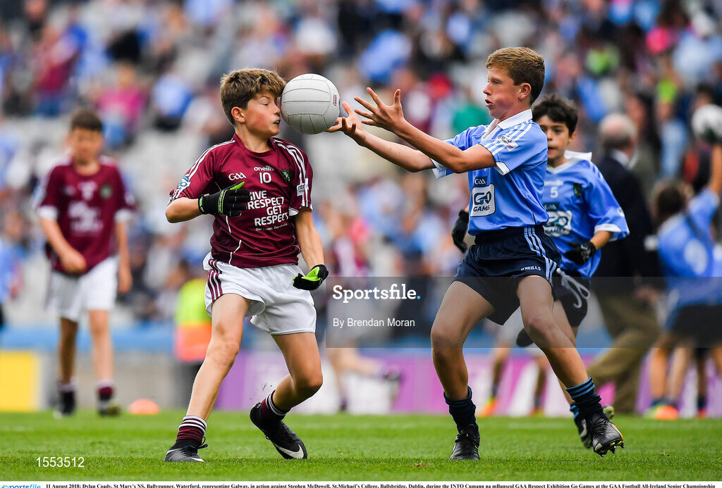11 August 2018; Dylan Coady, St Mary’s NS, Ballygunner, Waterford, representing Galway, in action against Stephen McDowell, St.Michael’s College, Ballsbridge, Dublin, during the INTO Cumann na mBunscol GAA Respect Exhibition Go Games at the GAA Football All-Ireland Senior Championship Semi Final match between Dublin and Galway at Croke Park in Dublin. Photo by Brendan Moran/Sportsfile