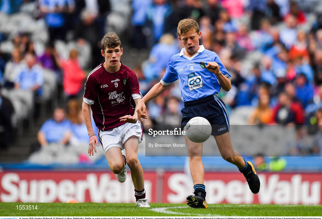 11 August 2018; Stephen McDowell, St.Michael’s College, Ballsbridge, Dublin, in action against Jack Gleeson, Ardcroney NS, Nenagh, Tipperary, representing Galway, during the INTO Cumann na mBunscol GAA Respect Exhibition Go Games at the GAA Football All-Ireland Senior Championship Semi Final match between Dublin and Galway at Croke Park in Dublin. Photo by Brendan Moran/Sportsfile