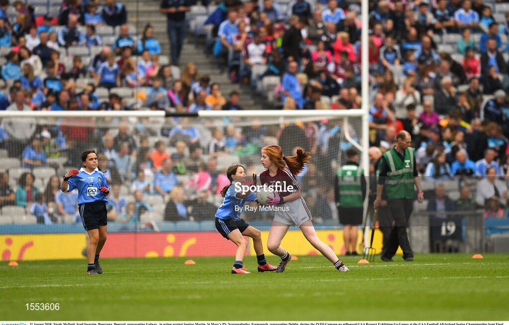 11 August 2018; Nicole McDaid, Scoil Iosagáin, Buncrana, Donegal, representing Galway, in action against Saoirse Martin, St Mary’s PS, Newtownbutler, Fermanagh, representing Dublin, during the INTO Cumann na mBunscol GAA Respect Exhibition Go Games at the GAA Football All-Ireland Senior Championship Semi Final match between Dublin and Galway at Croke Park in Dublin. Photo by Ray McManus/Sportsfile