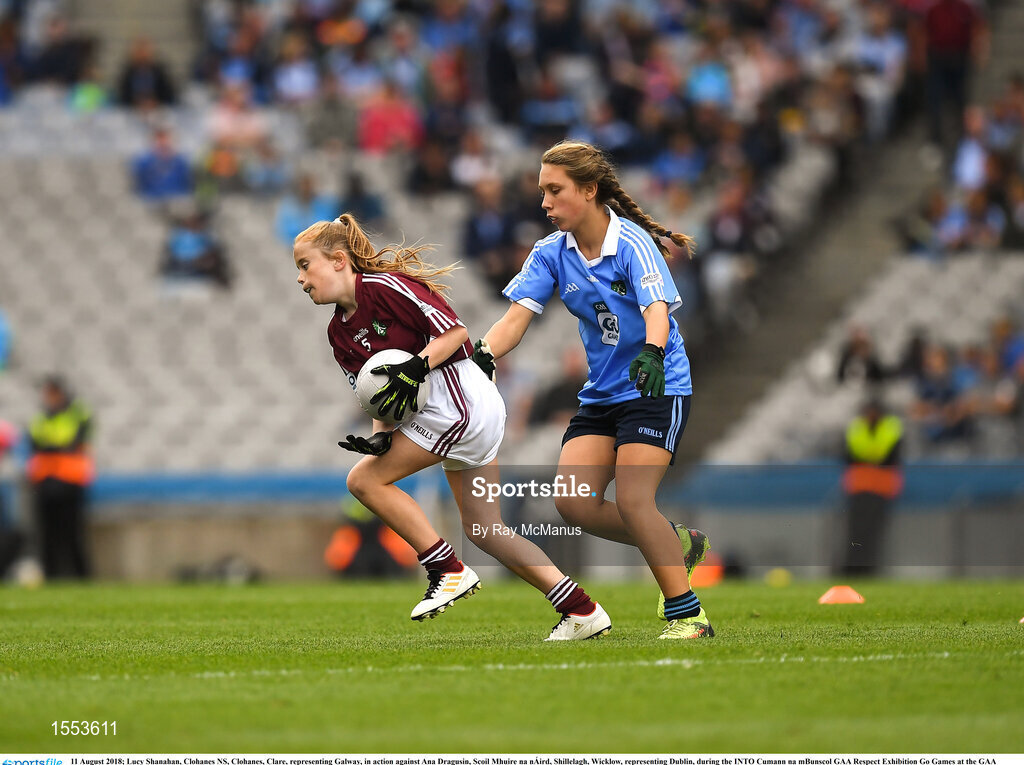 11 August 2018; Lucy Shanahan, Clohanes NS, Clohanes, Clare, representing Galway, in action against Ana Dragusin, Scoil Mhuire na nÁird, Shillelagh, Wicklow, representing Dublin, during the INTO Cumann na mBunscol GAA Respect Exhibition Go Games at the GAA Football All-Ireland Senior Championship Semi Final match between Dublin and Galway at Croke Park in Dublin. Photo by Ray McManus/Sportsfile