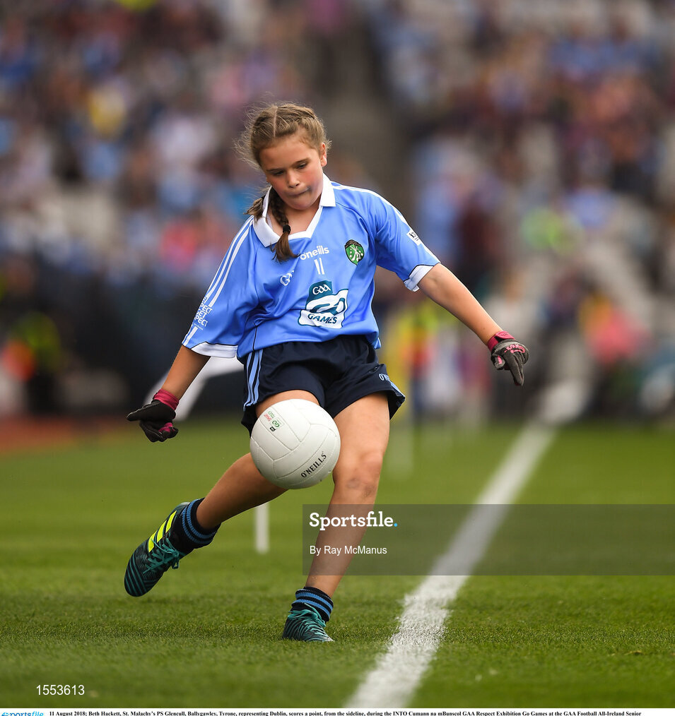 11 August 2018; Beth Hackett, St. Malachy’s PS Glencull, Ballygawley, Tyrone, representing Dublin, scores a point, from the sideline, during the INTO Cumann na mBunscol GAA Respect Exhibition Go Games at the GAA Football All-Ireland Senior Championship Semi Final match between Dublin and Galway at Croke Park in Dublin. Photo by Ray McManus/Sportsfile
