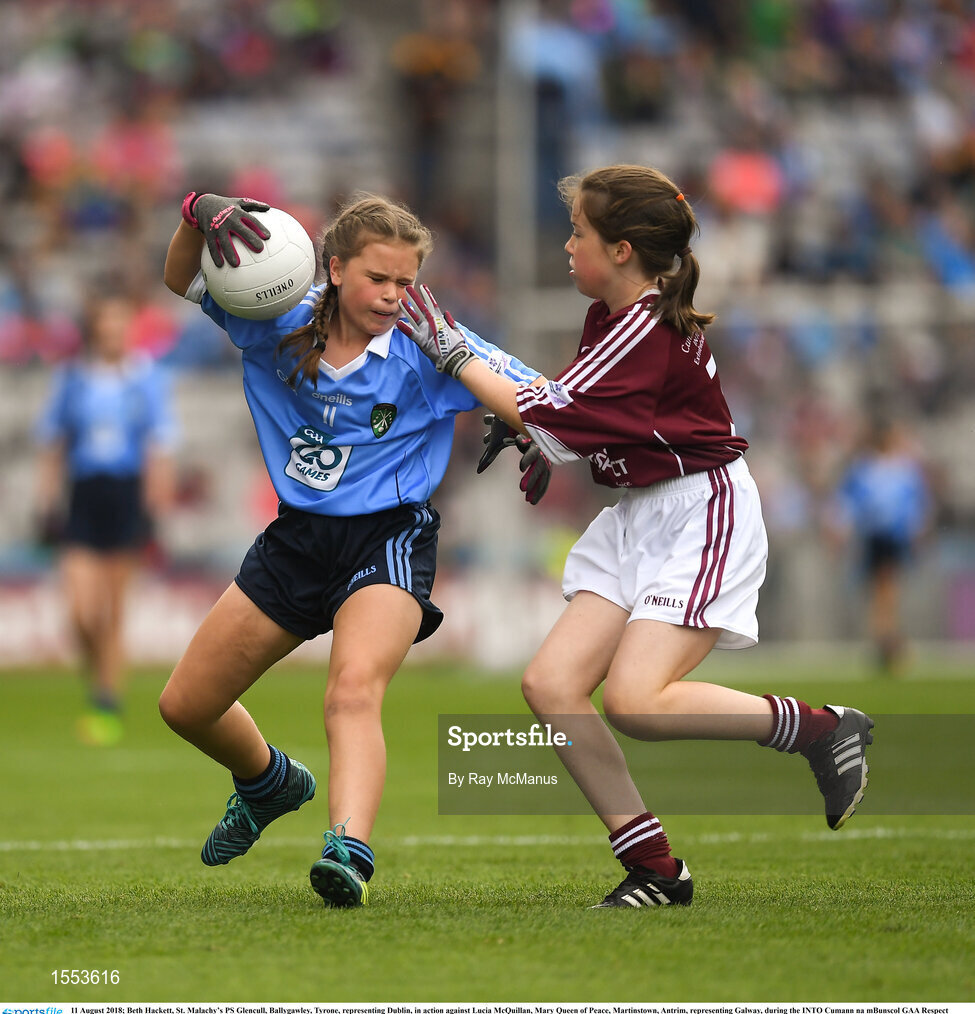 11 August 2018; Beth Hackett, St. Malachy’s PS Glencull, Ballygawley, Tyrone, representing Dublin, in action against Lucia McQuillan, Mary Queen of Peace, Martinstown, Antrim, representing Galway, during the INTO Cumann na mBunscol GAA Respect Exhibition Go Games at the GAA Football All-Ireland Senior Championship Semi Final match between Dublin and Galway at Croke Park in Dublin. Photo by Ray McManus/Sportsfile