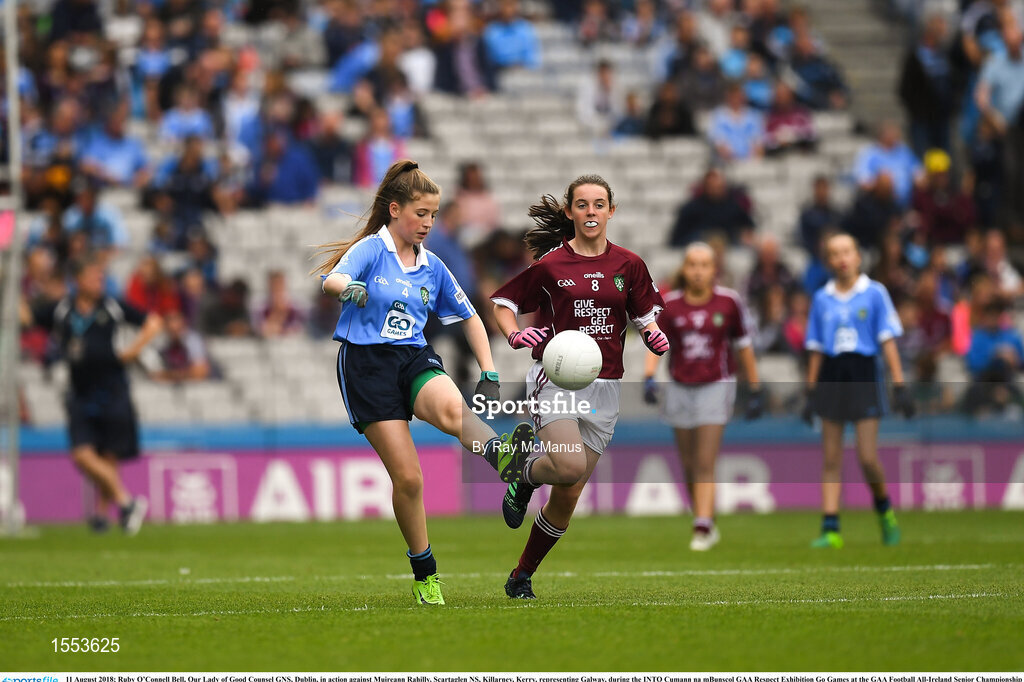 11 August 2018; Ruby O’Connell Bell, Our Lady of Good Counsel GNS, Dublin, in action against Muireann Rahilly, Scartaglen NS, Killarney, Kerry, representing Galway, during the INTO Cumann na mBunscol GAA Respect Exhibition Go Games at the GAA Football All-Ireland Senior Championship Semi Final match between Dublin and Galway at Croke Park in Dublin. Photo by Ray McManus/Sportsfile