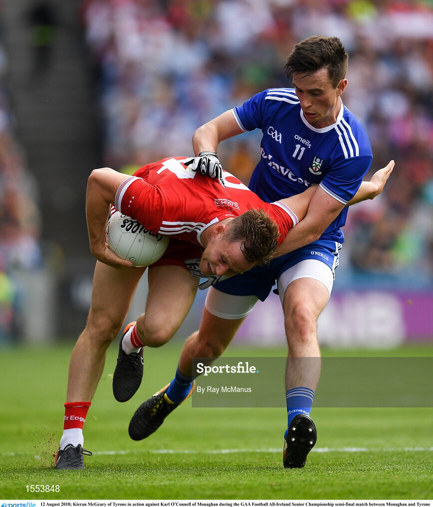 12 August 2018; Kieran McGeary of Tyrone in action against Karl O’Connell of Monaghan during the GAA Football All-Ireland Senior Championship semi-final match between Monaghan and Tyrone at Croke Park in Dublin. Photo by Ray McManus/Sportsfile