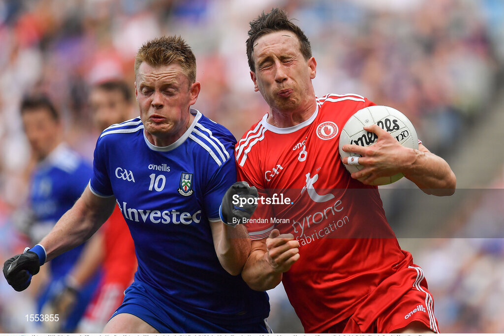 12 August 2018; Colm Cavanagh of Tyrone shoulders Ryan McAnespie of Monaghan during the GAA Football All-Ireland Senior Championship semi-final match between Monaghan and Tyrone at Croke Park in Dublin. Photo by Brendan Moran/Sportsfile