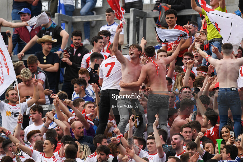 12 August 2018; Tyrone supporters on Hill 16 celebrate after the GAA Football All-Ireland Senior Championship semi-final match between Monaghan and Tyrone at Croke Park in Dublin. Photo by Ray McManus/Sportsfile