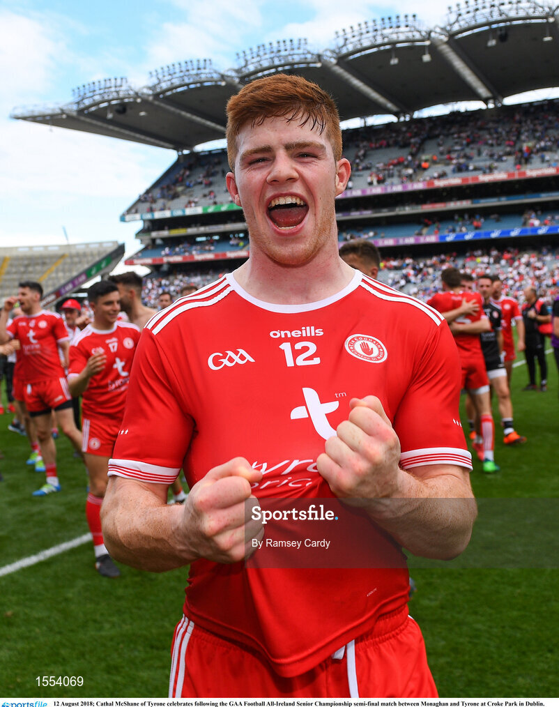 12 August 2018; Cathal McShane of Tyrone celebrates following the GAA Football All-Ireland Senior Championship semi-final match between Monaghan and Tyrone at Croke Park in Dublin. Photo by Ramsey Cardy/Sportsfile