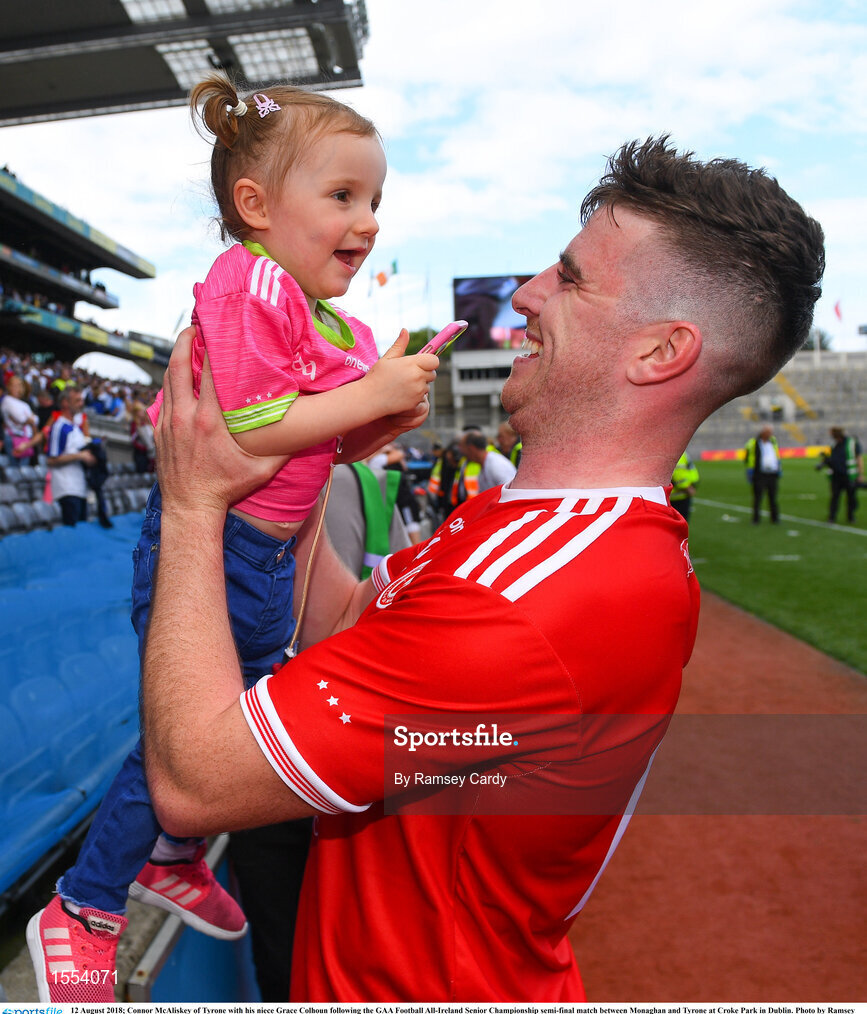 12 August 2018; Connor McAliskey of Tyrone with his niece Grace Colhoun following the GAA Football All-Ireland Senior Championship semi-final match between Monaghan and Tyrone at Croke Park in Dublin. Photo by Ramsey Cardy/Sportsfile