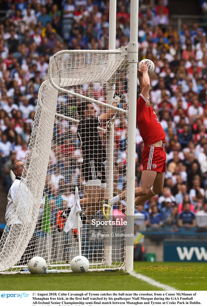 12 August 2018; Colm Cavanagh of Tyrone catches the ball near the crossbar, from a Conor McManus of Monaghan free kick, in the first half watched by his goalkeeper Niall Morgan during the GAA Football All-Ireland Senior Championship semi-final match between Monaghan and Tyrone at Croke Park in Dublin. Photo by Piaras Ó Mídheach/Sportsfile