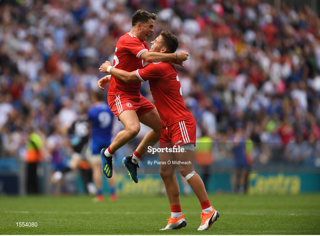 12 August 2018; Tyrone players Ronan O'Neill, left, and Michael McKernan celebrate after the GAA Football All-Ireland Senior Championship semi-final match between Monaghan and Tyrone at Croke Park in Dublin. Photo by Piaras Ó Mídheach/Sportsfile