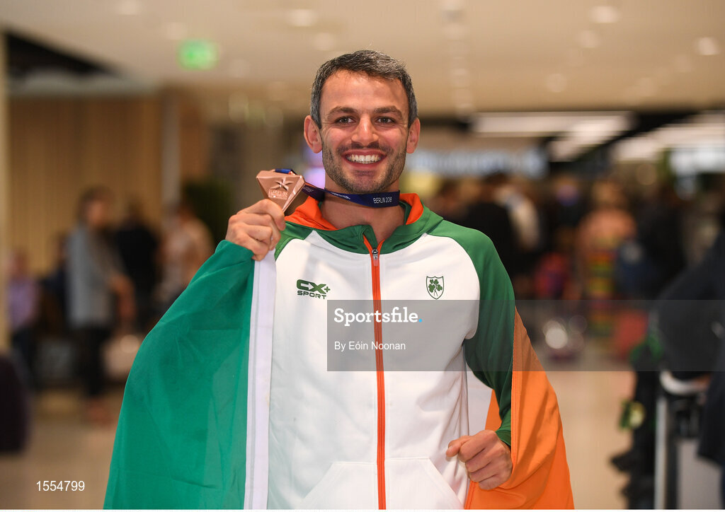 13 August 2018; Thomas Barr with his bronze medal at the Homecoming of the Irish Team from the European Athletics Championships in Berlin at Terminal 1 in Dublin Airport. Photo by Eóin Noonan/Sportsfile