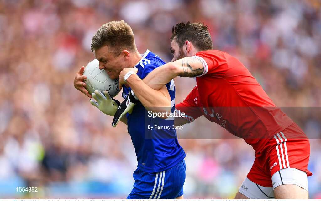 12 August 2018; Conor McCarthy of Monaghan is tackled by Ronan McNamee of Tyrone during the GAA Football All-Ireland Senior Championship semi-final match between Monaghan and Tyrone at Croke Park in Dublin. Photo by Ramsey Cardy/Sportsfile