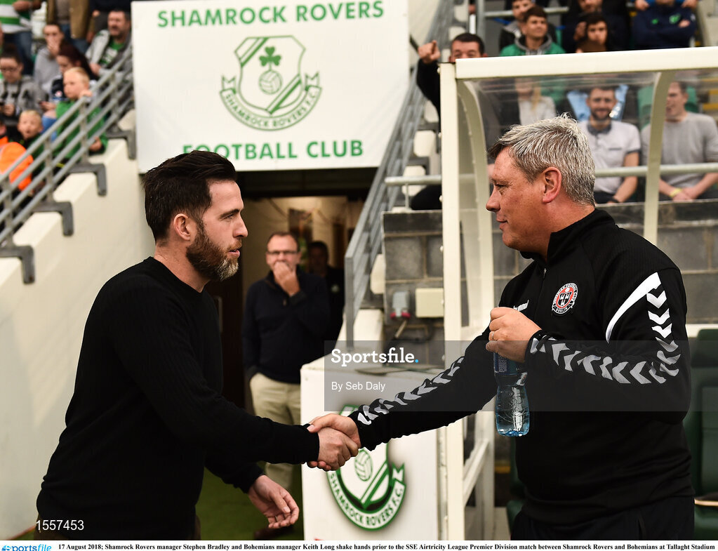 17 August 2018; Shamrock Rovers manager Stephen Bradley and Bohemians manager Keith Long shake hands prior to the SSE Airtricity League Premier Division match between Shamrock Rovers and Bohemians at Tallaght Stadium in Dublin. Photo by Seb Daly/Sportsfile
