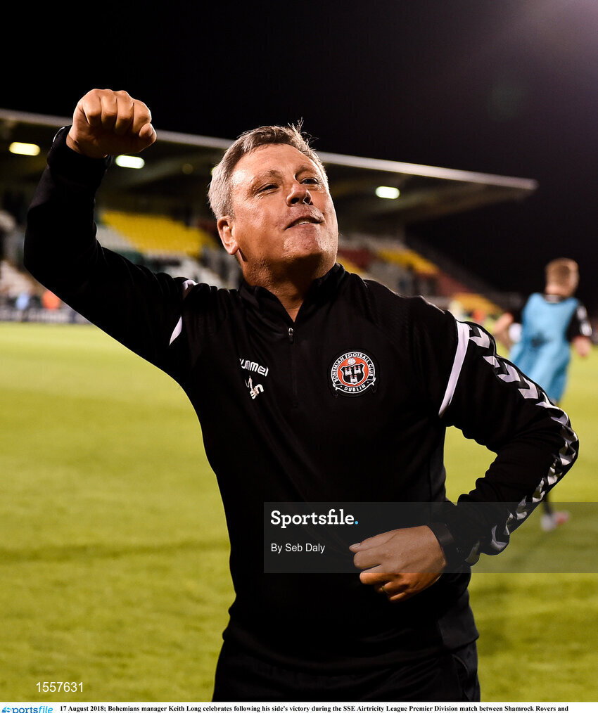 17 August 2018; Bohemians manager Keith Long celebrates following his side's victory during the SSE Airtricity League Premier Division match between Shamrock Rovers and Bohemians at Tallaght Stadium in Dublin. Photo by Seb Daly/Sportsfile