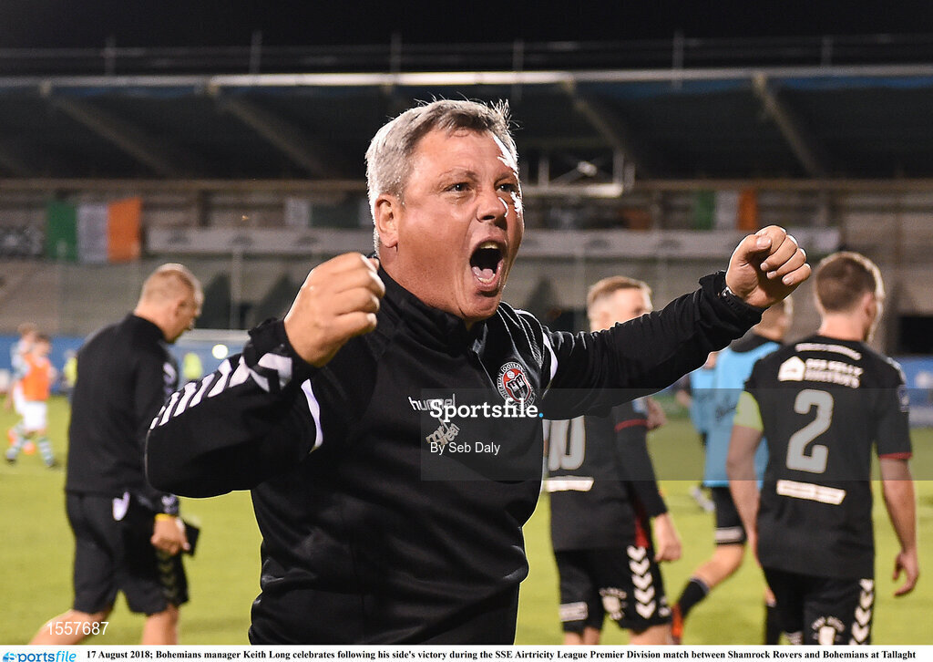 17 August 2018; Bohemians manager Keith Long celebrates following his side's victory during the SSE Airtricity League Premier Division match between Shamrock Rovers and Bohemians at Tallaght Stadium in Dublin. Photo by Seb Daly/Sportsfile
