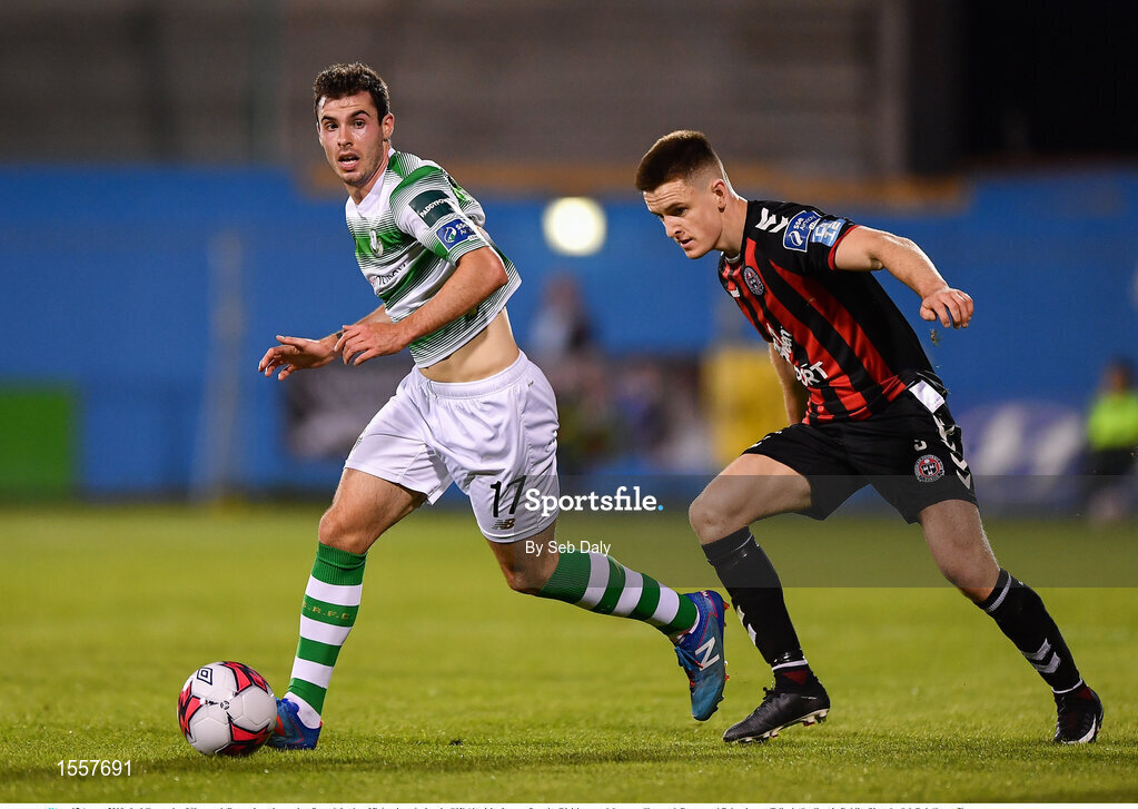 17 August 2018; Joel Coustrain of Shamrock Rovers in action against Daragh Leahy of Bohemians during the SSE Airtricity League Premier Division match between Shamrock Rovers and Bohemians at Tallaght Stadium in Dublin. Photo by Seb Daly/Sportsfile