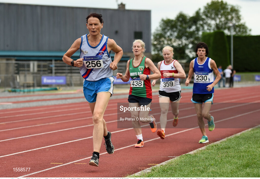 18 August 2018; Sheelagh Jones of Dundrum South Dublin A.C., W60, 1500m during the Irish Life Health National Track & Field Masters Championships at Tullamore Harriers Stadium in Offaly. Photo by Piaras Ó Mídheach/Sportsfile