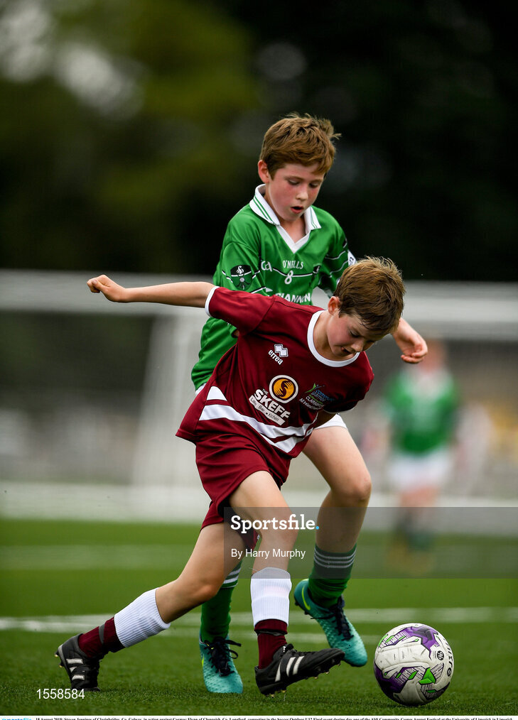 18 August 2018; Steven Jennings of Clarinbridge, Co. Galway, in action against Cormac Flynn of Clonguish, Co. Longford, competing in the Soccer Outdoor U12 Final event during day one of the Aldi Community Games August Festival at the University of Limerick in Limerick. Photo by Harry Murphy/Sportsfile