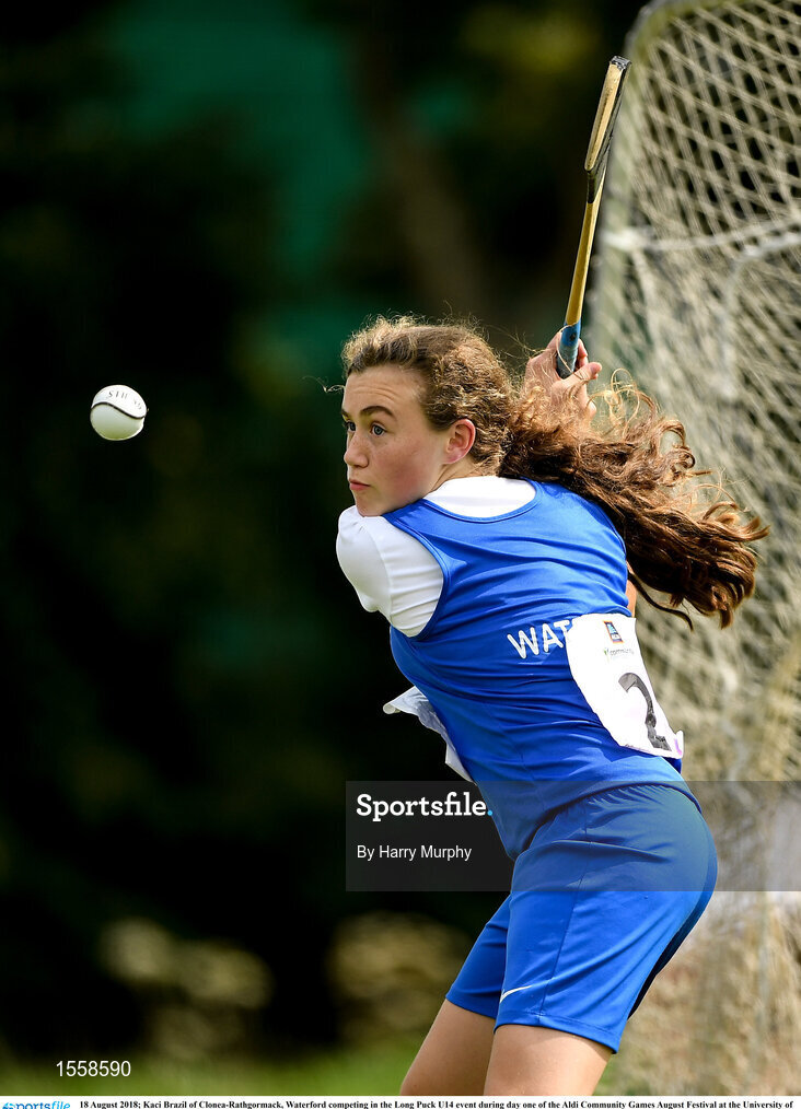 18 August 2018; Kaci Brazil of Clonea-Rathgormack, Waterford competing in the Long Puck U14 event during day one of the Aldi Community Games August Festival at the University of Limerick in Limerick. Photo by Harry Murphy/Sportsfile