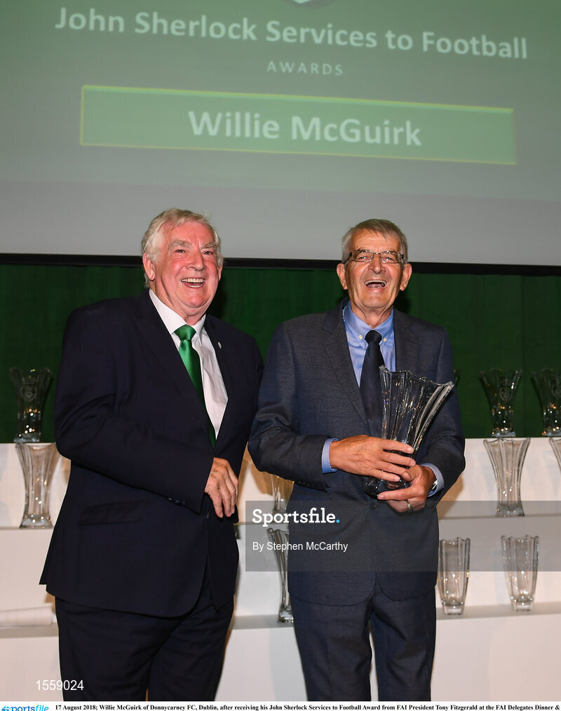 17 August 2018; Willie McGuirk of Donnycarney FC, Dublin, after receiving his John Sherlock Services to Football Award from FAI President Tony Fitzgerald at the FAI Delegates Dinner & FAI Communications Awards at the Rochestown Park Hotel in Cork. Photo by Stephen McCarthy/Sportsfile