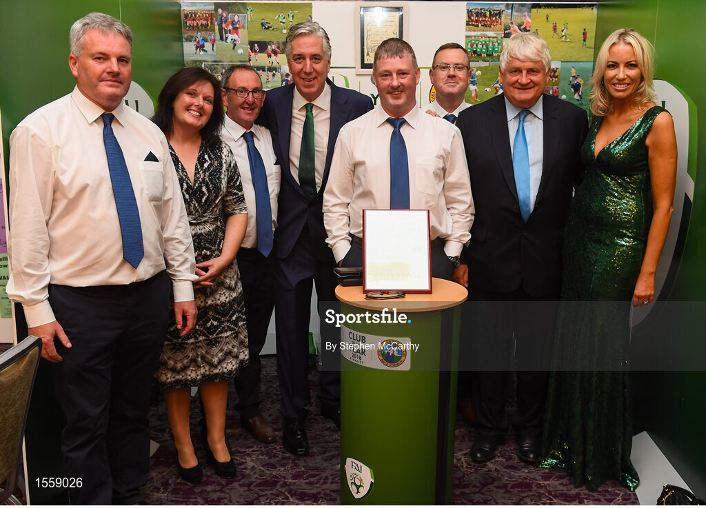 17 August 2018; John Delaney, CEO, Football Association of Ireland, his partner Emma English and Denis O'Brien with attendees from Ballymackey FC in Tipperary at the FAI Delegates Dinner & FAI Communications Awards at the Rochestown Park Hotel in Cork. Photo by Stephen McCarthy/Sportsfile