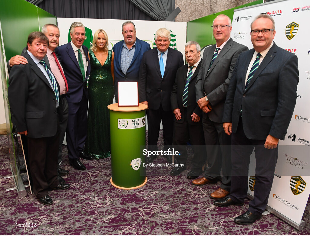 17 August 2018; John Delaney, CEO, Football Association of Ireland, his partner Emma English and Denis O'Brien with attendees from Gweedore Celtic in Donegal at the FAI Delegates Dinner & FAI Communications Awards at the Rochestown Park Hotel in Cork. Photo by Stephen McCarthy/Sportsfile