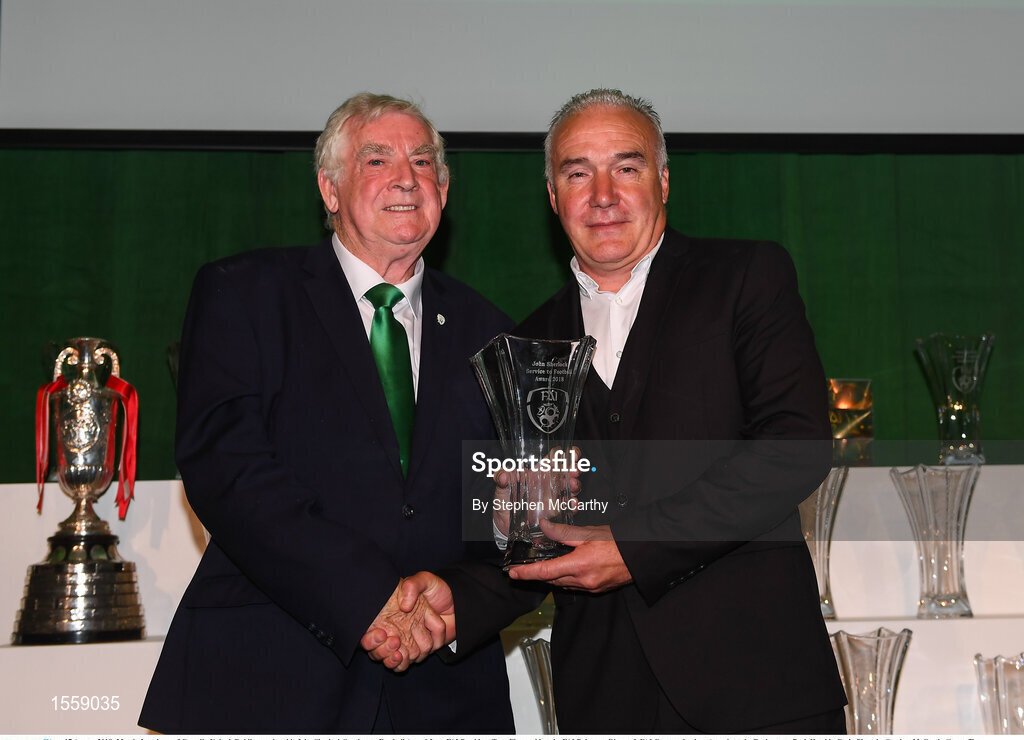 17 August 2018; Martin Loughran of Crumlin United, Dublin, receives his John Sherlock Services to Football Award from FAI President Tony Fitzgerald at the FAI Delegates Dinner & FAI Communications Awards at the Rochestown Park Hotel in Cork. Photo by Stephen McCarthy/Sportsfile