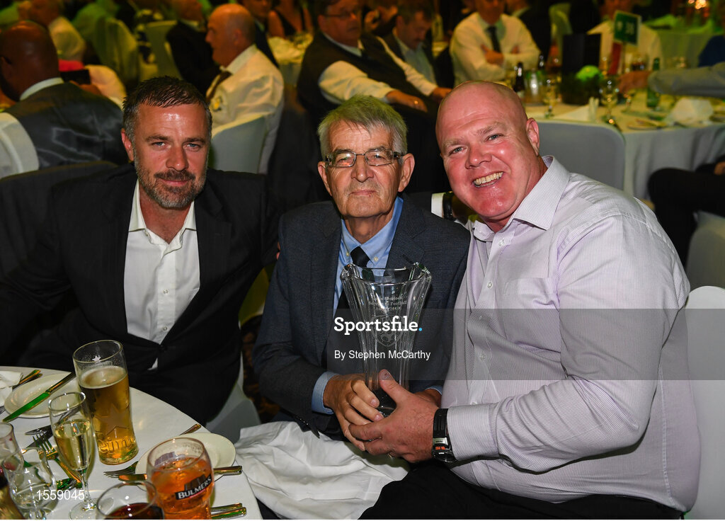 17 August 2018; Attendees, from left, Stuart Masterson, Willie McGuirk, who received a John Sherlock Services to Football Award, and Michael McDonald at the FAI Delegates Dinner & FAI Communications Awards at the Rochestown Park Hotel in Cork. Photo by Stephen McCarthy/Sportsfile
