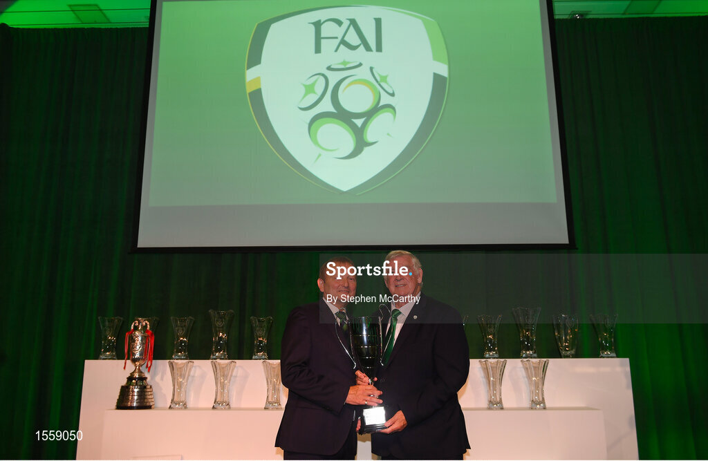 17 August 2018; David Martin, President of the Irish Football Association, left, and FAI President Tony Fitzgerald with The President's Junior Cup at the FAI Delegates Dinner & FAI Communications Awards at the Rochestown Park Hotel in Cork. Photo by Stephen McCarthy/Sportsfile