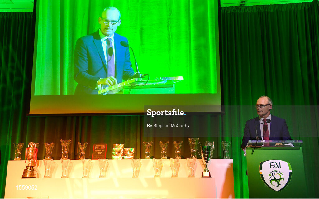 17 August 2018; An Tánaiste Simon Coveney TD speaking at the FAI Delegates Dinner & FAI Communications Awards at the Rochestown Park Hotel in Cork. Photo by Stephen McCarthy/Sportsfile
