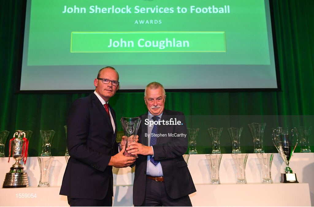 17 August 2018; John Coughlan of Springfield Ramblers AFC, Cork, receives his John Sherlock Services to Football Award from An Tánaiste Simon Coveney TD at the FAI Delegates Dinner & FAI Communications Awards at the Rochestown Park Hotel in Cork. Photo by Stephen McCarthy/Sportsfile