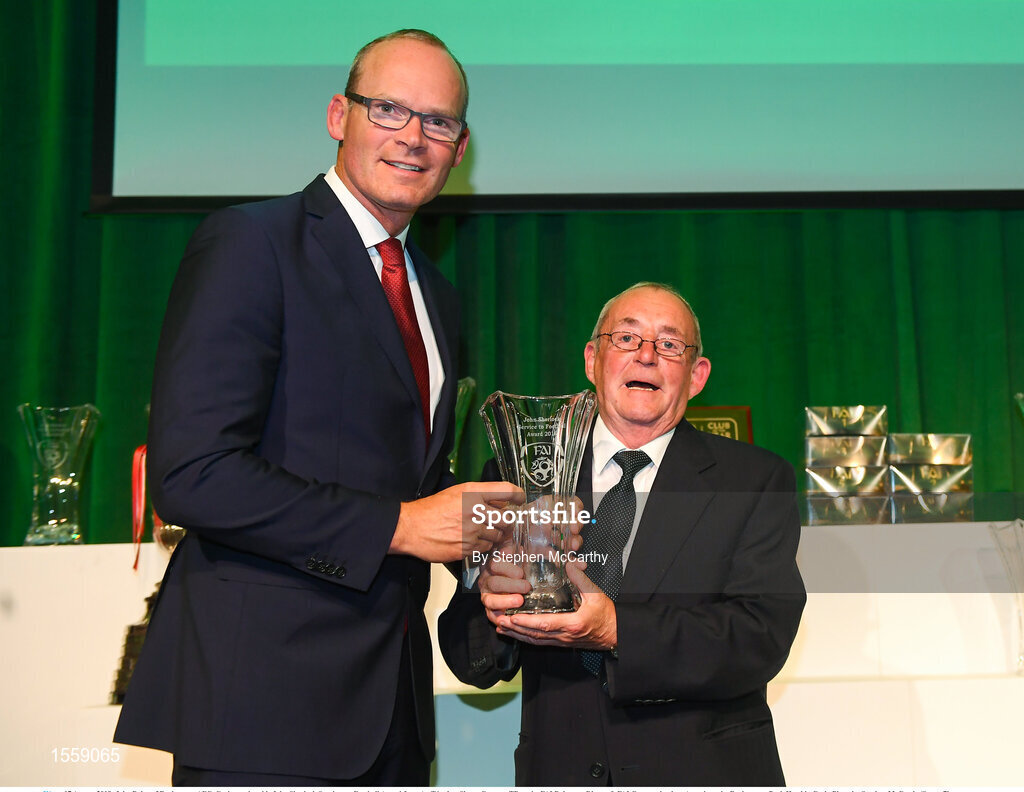 17 August 2018; John Delea of Rockmount AFC, Cork, receives his John Sherlock Services to Football Award from An Tánaiste Simon Coveney TD at the FAI Delegates Dinner & FAI Communications Awards at the Rochestown Park Hotel in Cork. Photo by Stephen McCarthy/Sportsfile
