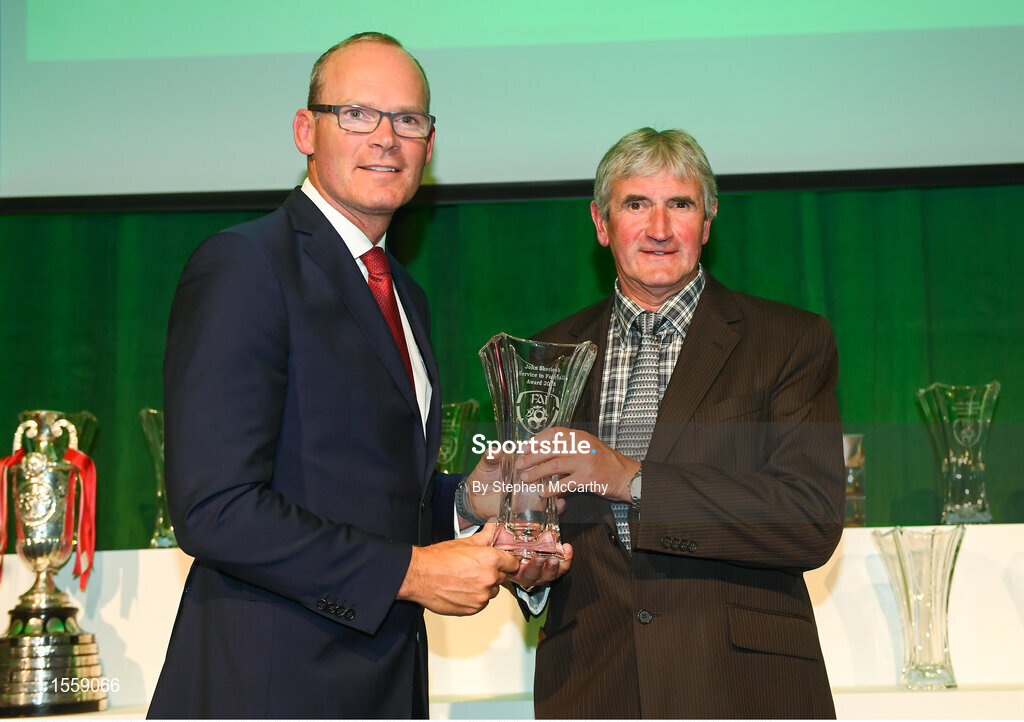 17 August 2018; Sean Lynch of Innishvilla SC, Cork, receives his John Sherlock Services to Football Award from An Tánaiste Simon Coveney TD at the FAI Delegates Dinner & FAI Communications Awards at the Rochestown Park Hotel in Cork. Photo by Stephen McCarthy/Sportsfile