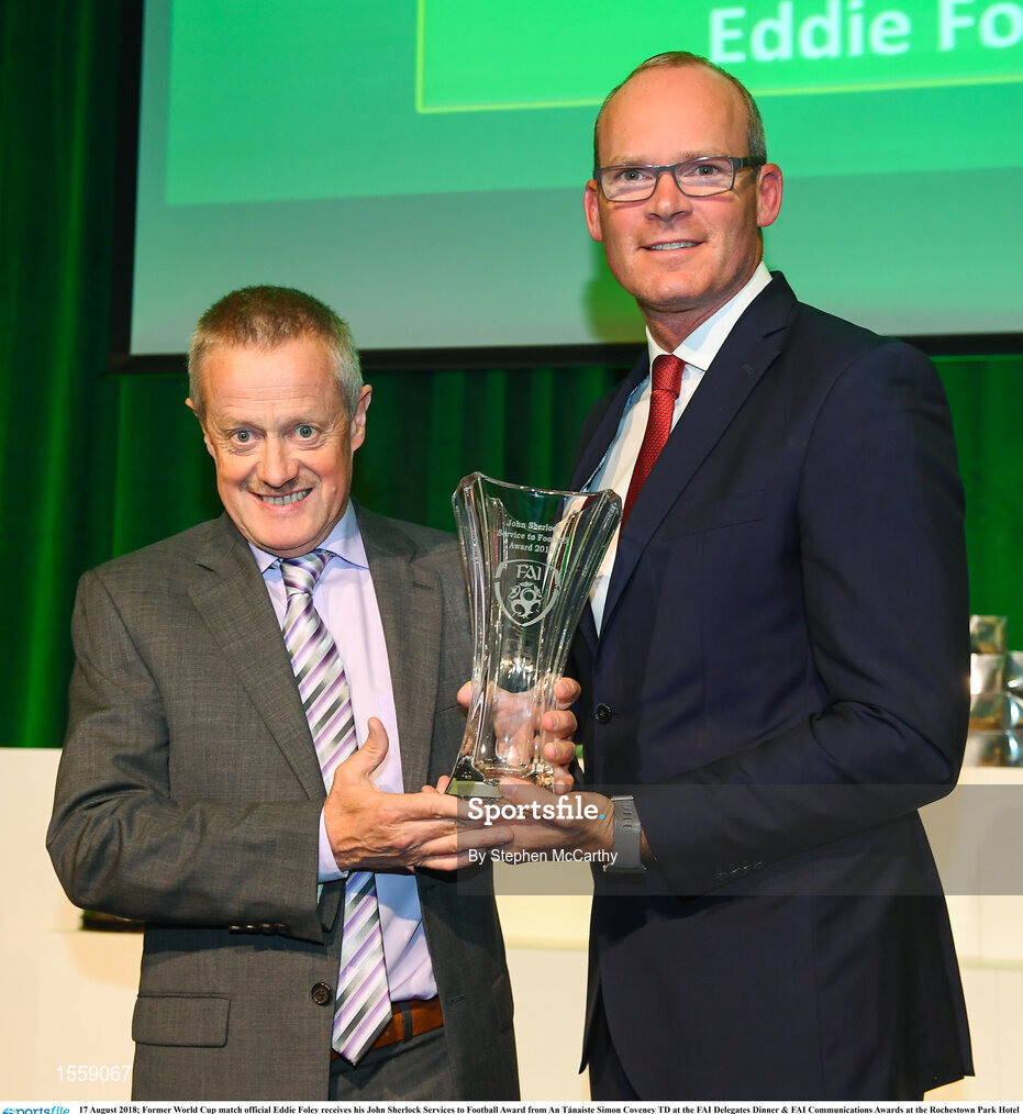 17 August 2018; Former World Cup match official Eddie Foley receives his John Sherlock Services to Football Award from An Tánaiste Simon Coveney TD at the FAI Delegates Dinner & FAI Communications Awards at the Rochestown Park Hotel in Cork. Photo by Stephen McCarthy/Sportsfile