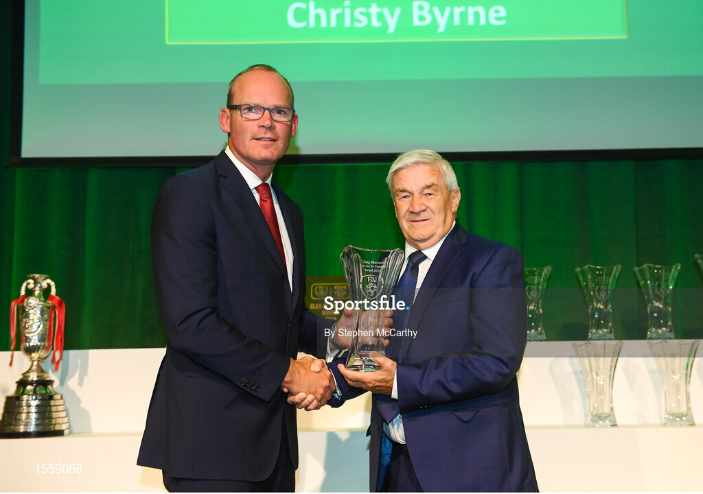 17 August 2018; Christy Byrne of Castleview AFC, Cork, receives his John Sherlock Services to Football Award from An Tánaiste Simon Coveney TD at the FAI Delegates Dinner & FAI Communications Awards at the Rochestown Park Hotel in Cork. Photo by Stephen McCarthy/Sportsfile