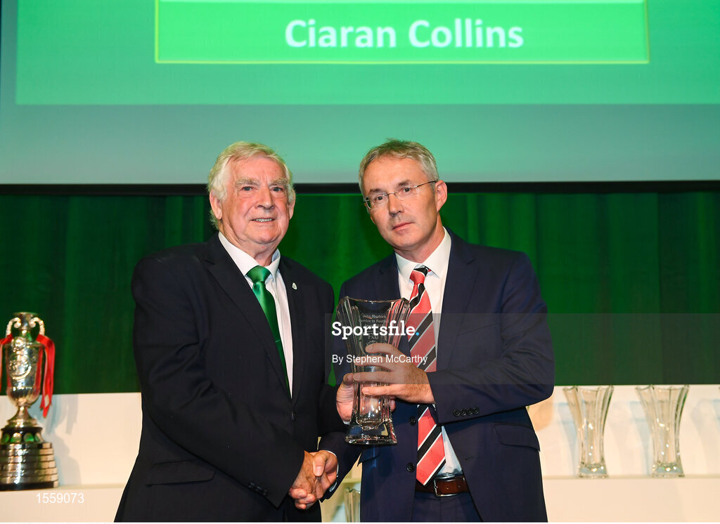 17 August 2018; Ciaran Collins of Fern Celtic FC, Clare, receives his John Sherlock Services to Football Award from FAI President Tony Fitzgerald at the FAI Delegates Dinner & FAI Communications Awards at the Rochestown Park Hotel in Cork. Photo by Stephen McCarthy/Sportsfile
