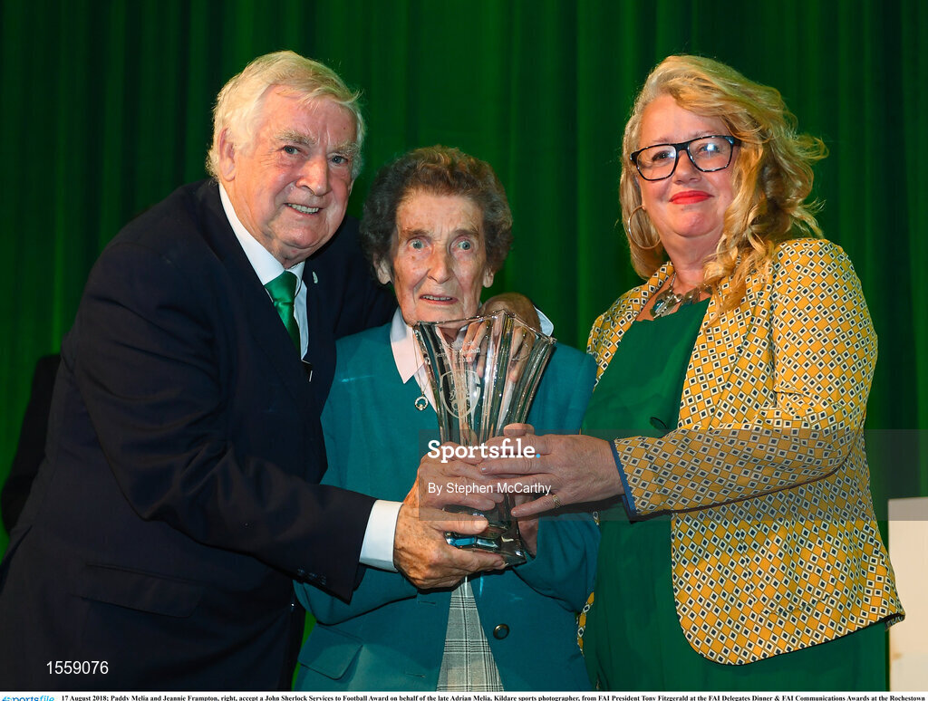 17 August 2018; Paddy Melia and Jeannie Frampton, right, accept a John Sherlock Services to Football Award on behalf of the late Adrian Melia, Kildare sports photographer, from FAI President Tony Fitzgerald at the FAI Delegates Dinner & FAI Communications Awards at the Rochestown Park Hotel in Cork. Photo by Stephen McCarthy/Sportsfile
