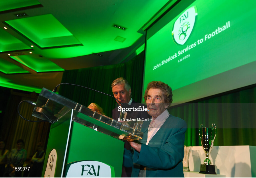 17 August 2018; Paddy Melia after accepting a John Sherlock Services to Football Award on behalf of the late Adrian Melia, Kildare sports photographer, at the FAI Delegates Dinner & FAI Communications Awards at the Rochestown Park Hotel in Cork. Photo by Stephen McCarthy/Sportsfile
