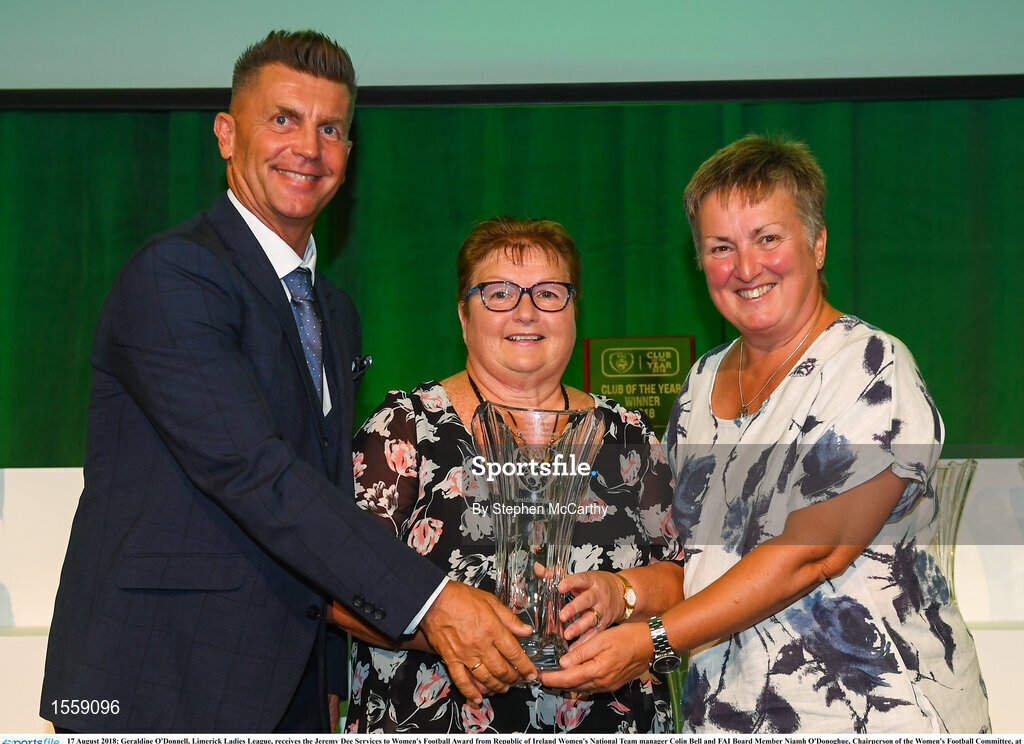 17 August 2018; Geraldine O'Donnell, Limerick Ladies League, receives the Jeremy Dee Services to Women's Football Award from Republic of Ireland Women's National Team manager Colin Bell and FAI Board Member Niamh O'Donoghue, Chairperson of the Women's Football Committee, at the FAI Delegates Dinner & FAI Communications Awards at the Rochestown Park Hotel in Cork. Photo by Stephen McCarthy/Sportsfile