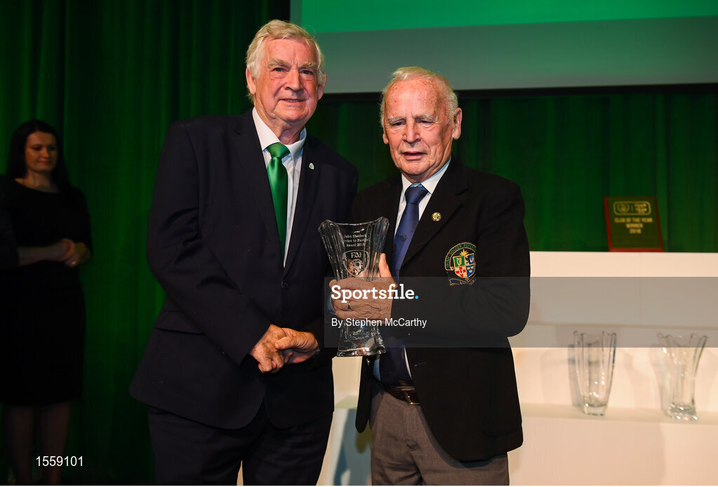 17 August 2018; Jimmy Mooney, Wicklow Branch referee, receives his John Sherlock Services to Football Award from FAI President Tony Fitzgerald at the FAI Delegates Dinner & FAI Communications Awards at the Rochestown Park Hotel in Cork. Photo by Stephen McCarthy/Sportsfile