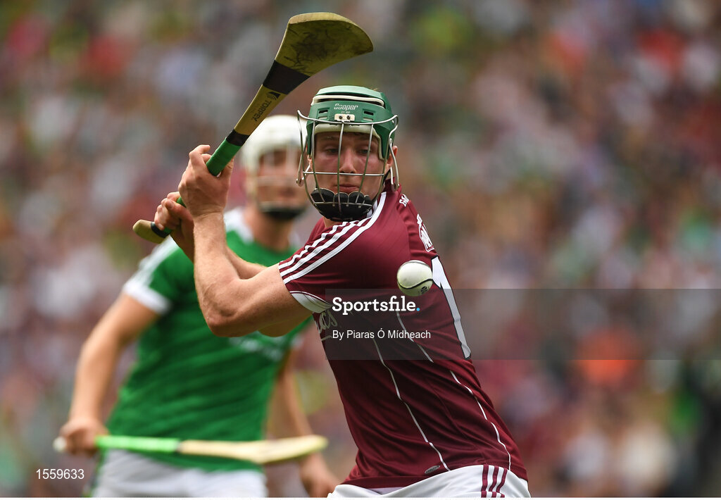 19 August 2018; Cathal Mannion of Galway shoots as Kyle Hayes of Limerick closes in during the GAA Hurling All-Ireland Senior Championship Final match between Galway and Limerick at Croke Park in Dublin. Photo by Piaras Ó Mídheach/Sportsfile