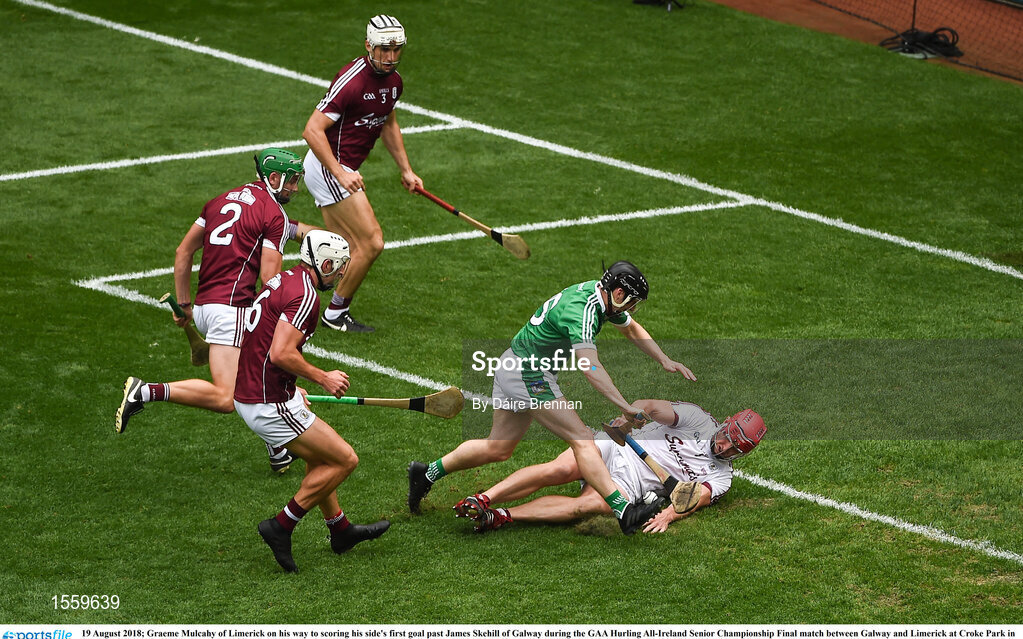 19 August 2018; Graeme Mulcahy of Limerick on his way to scoring his side's first goal past James Skehill of Galway during the GAA Hurling All-Ireland Senior Championship Final match between Galway and Limerick at Croke Park in Dublin. Photo by Daire Brennan/Sportsfile