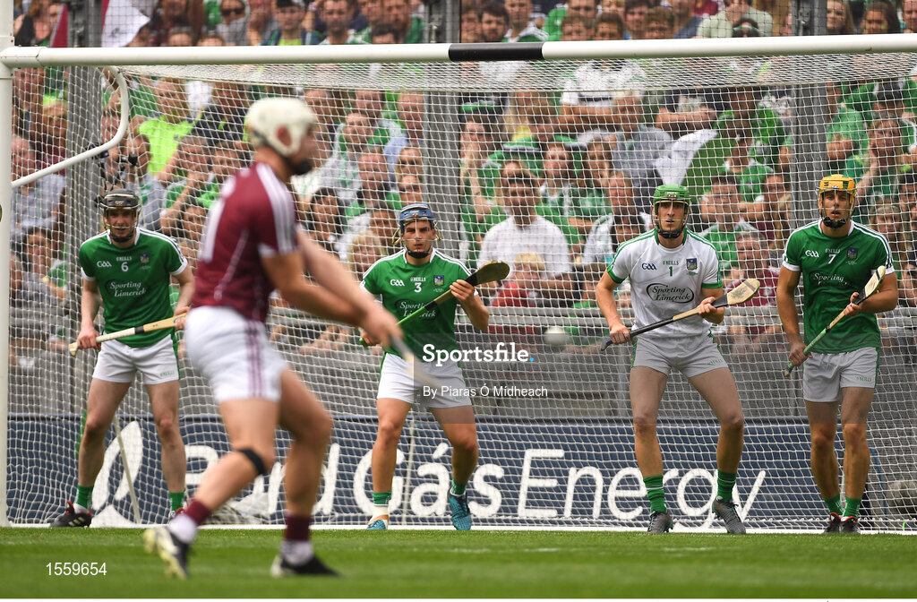 19 August 2018; Limerick players, from left, Declan Hannon, Mike Casey, Nickie Quaid, and Dan Morrissey watch Joe Canning of Galway score a point from a free during the GAA Hurling All-Ireland Senior Championship Final match between Galway and Limerick at Croke Park in Dublin. Photo by Piaras Ó Mídheach/Sportsfile