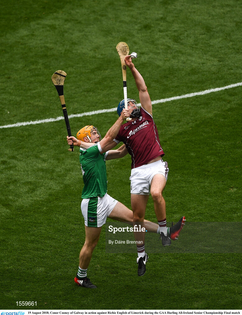 19 August 2018; Conor Cooney of Galway in action against Richie English of Limerick during the GAA Hurling All-Ireland Senior Championship Final match between Galway and Limerick at Croke Park in Dublin. Photo by Daire Brennan/Sportsfile
