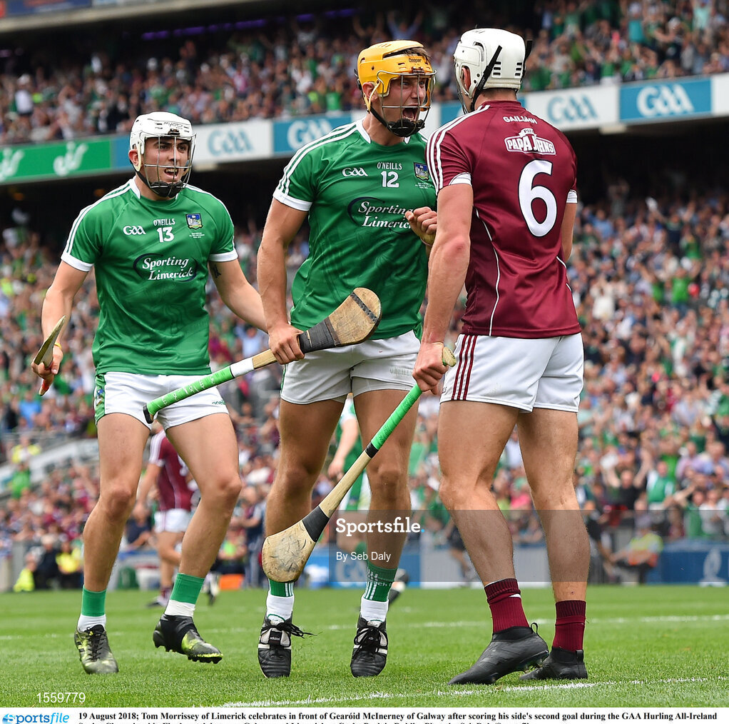 19 August 2018; Tom Morrissey of Limerick celebrates in front of Gearóid McInerney of Galway after scoring his side's second goal during the GAA Hurling All-Ireland Senior Championship Final match between Galway and Limerick at Croke Park in Dublin. Photo by Seb Daly/Sportsfile