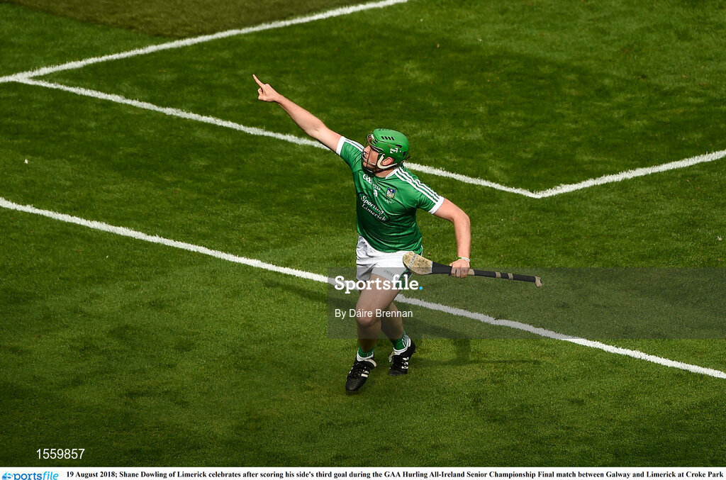 19 August 2018; Shane Dowling of Limerick celebrates after scoring his side's third goal during the GAA Hurling All-Ireland Senior Championship Final match between Galway and Limerick at Croke Park in Dublin. Photo by Daire Brennan/Sportsfile
