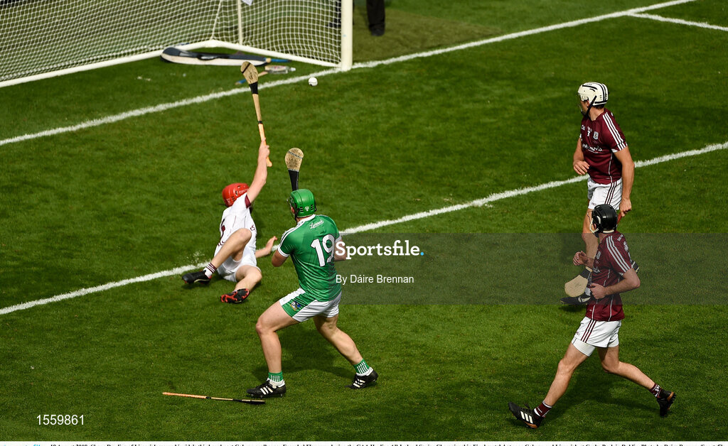 19 August 2018; Shane Dowling of Limerick scores his side's third goal past Galway goalkeeper Fearghal Flannery during the GAA Hurling All-Ireland Senior Championship Final match between Galway and Limerick at Croke Park in Dublin. Photo by Daire Brennan/Sportsfile