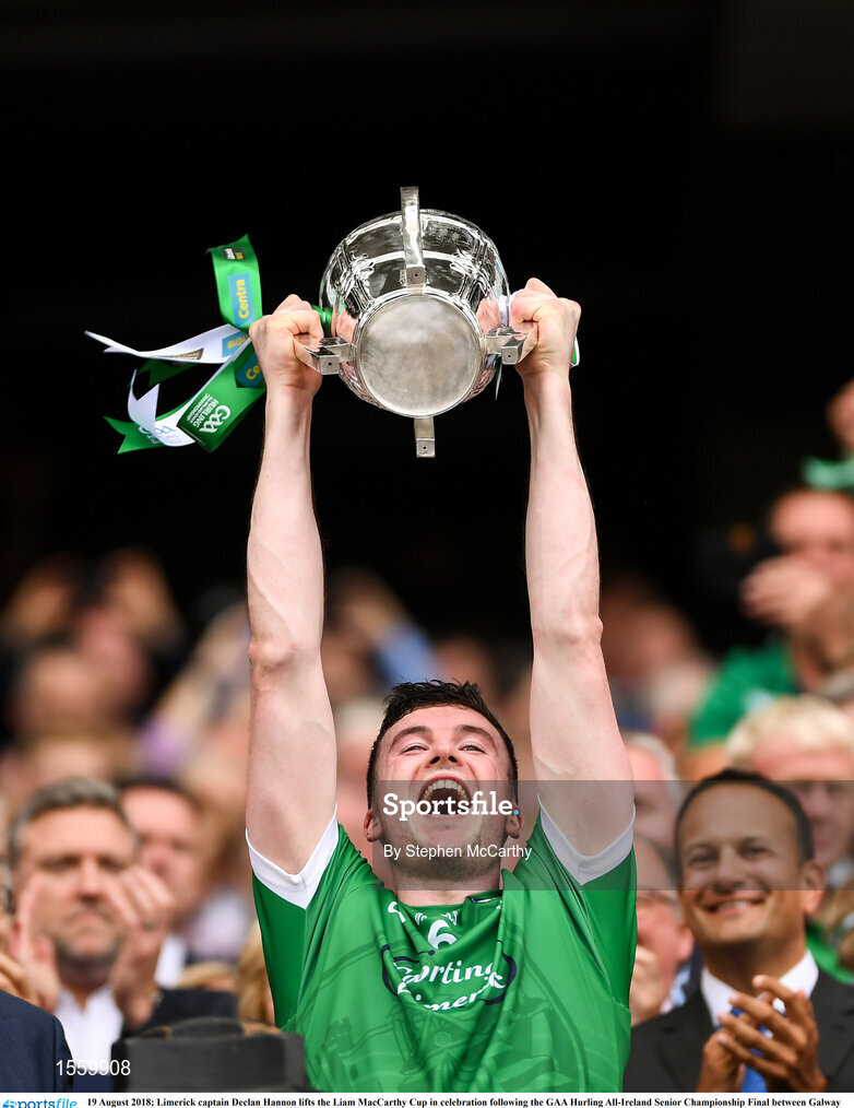 19 August 2018; Limerick captain Declan Hannon lifts the Liam MacCarthy Cup in celebration following the GAA Hurling All-Ireland Senior Championship Final between Galway and Limerick at Croke Park in Dublin. Photo by Stephen McCarthy/Sportsfile