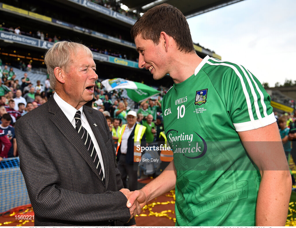 19 August 2018; Gearóid Hegarty of Limerick is congratulated by Commentator Micheál Ó Muircheartaigh following the GAA Hurling All-Ireland Senior Championship Final match between Galway and Limerick at Croke Park in Dublin. Photo by Seb Daly/Sportsfile