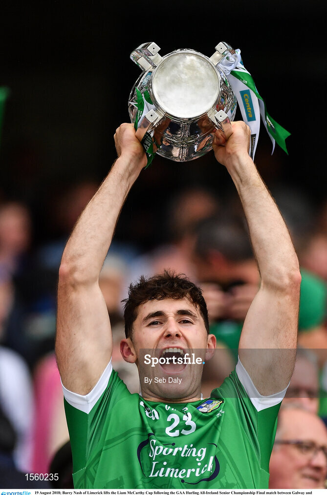 19 August 2018; Barry Nash of Limerick lifts the Liam MacCarthy Cup following the GAA Hurling All-Ireland Senior Championship Final match between Galway and Limerick at Croke Park in Dublin. Photo by Seb Daly/Sportsfile